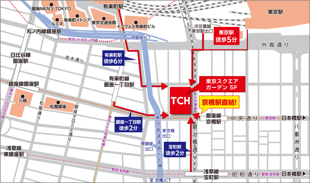 | アクセス | JR「東京駅」八重洲南口 徒歩5分 JR「有楽町駅」京橋口 徒歩6分 東京メトロ銀座線「京橋駅」3番出口 直結 東京メトロ有楽町線「銀座一丁目駅」7番出口 徒歩2分 都営浅草線「宝町駅」A4出口 徒歩2分 |