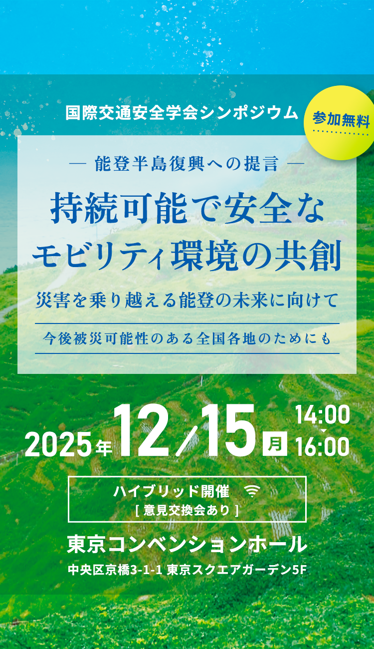 国際交通安全学会では、これまで自然・社会・人文等の諸領域にまたがる「学際性」と、国内・海外という限られた発想にとらわれない「国際性」を重視して、半世紀以上にわたり「理想的な交通社会の実現」に向けて活動してまいりました。能登半島地震の復興において、様々な学協会が多様な学術的な支援や提言を行う中で、本会におきましても一日も早い交通社会の再生を目指して、本会の特徴である「実際性」と「先見性」を重視しつつ、能登半島の復興まちづくりに向けた独自の調査・研究を行ってまいりました。