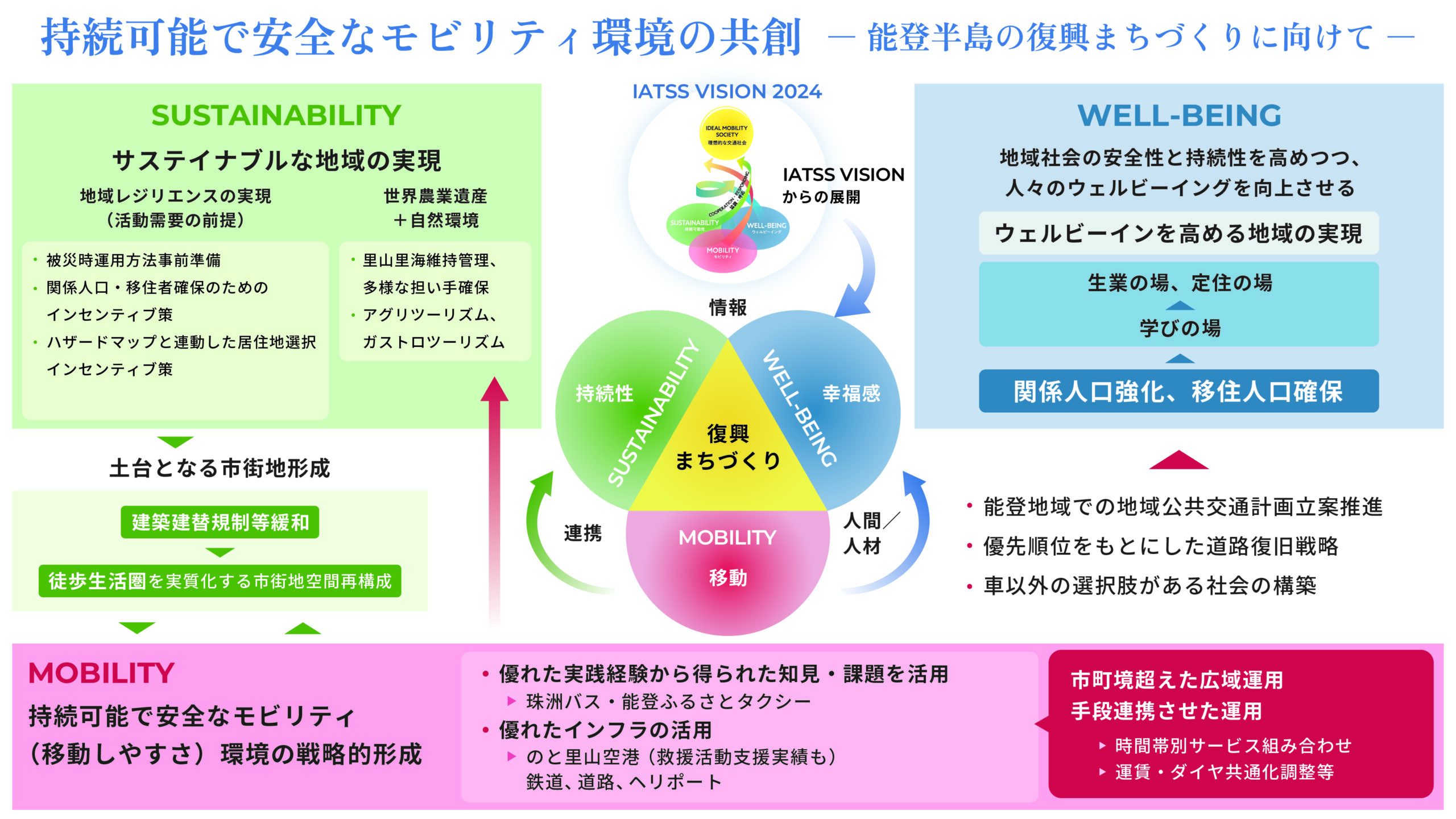当学会では、2011年の東日本大震災時と同様に、能登半島地震でも発災の約半年後に復興を検討するプロジェクトを立ち上げました。このプロジェクトでは、昨年9月の学会創立50周年式典で発信いたしました「モビリティ」「サステナビリティ」「ウェルビーイング」を柱とした「IATSS VISION 2024」に基づき、モビリティを軸にした具体的な戦略を検討してまいりました。今回は、その具体的成果を公表させていただくとともに、パネルディスカッションを通じて、さらに深い理解を皆様に得ていただきたいと考えております。